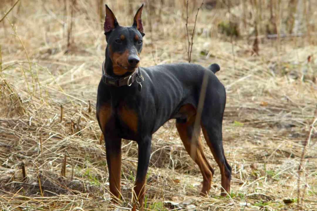 Standing 17–20 inches tall and weighing 25–45 pounds, the German Pinscher boasts a lean, muscular build with a short, dense coat in colors like black, blue, fawn, and red, often accented by tan markings15. Its square-proportioned body, alert almond-shaped eyes, and erect ears (either natural or cropped) exude a sharp, vigilant expression1. A traditionally docked tail adds to its athletic silhouette, though undocked tails are increasingly common and carried in a sabre-like curve1.